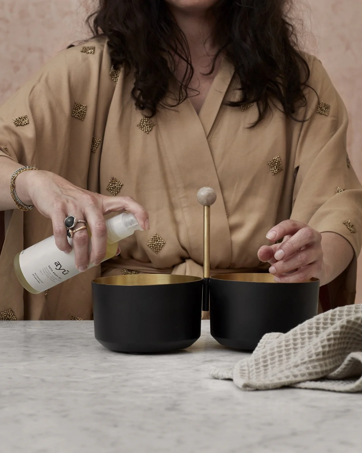 Det elegante design i messing med marmorhåndtag gør håndbadet til mere end et plejeredskab – det fungerer også som dekorativ opbevaring af små håndklæder, plejeprodukter eller accessories.