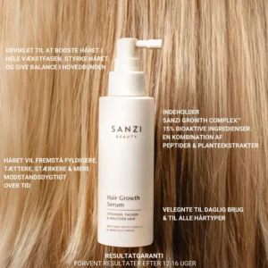 Sanzi Growth Complex™ er en nøje udviklet ingrediensblanding skabt af Sanzi Beauty i København. Formlen indeholder 21 udvalgte ingredienser, hvoraf 15% består af aktive ingredienser. Sammensætningen er resultatet af mere end 10 års erfaring med udvikling og test af effektive formuleringer til hårvækst. Hvert ingrediensvalg er optimeret for at opnå den bedst mulige effekt, til de forskellige vækstfaser i håret.